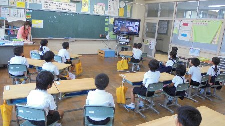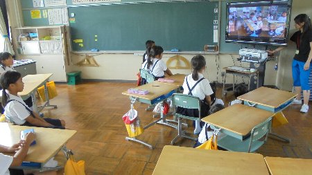 4年生も1年生も同じビデオを見ています!?なにやら6年生が写っているようです。