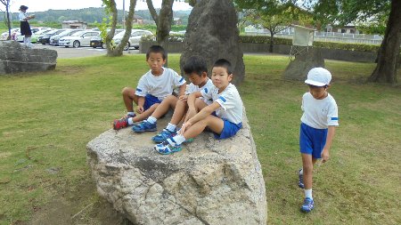 前庭の芝生の所に大きな石がいくつか置いてあります。バッタを捕まえるのに疲れた1年生が乗っかっています。写真の左奥にも見えますか?