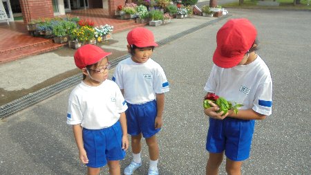 そのそばを最後の収穫でしょうか、畑から土日の間に実ったピーマンなどを教室に2年生が運んでいました。この前ピーマンをもらいました。美味しそうだったのでその場で丸かじりすると驚いていました(笑)