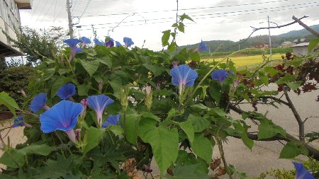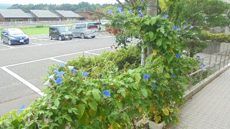 体育館前のアサガオ、日照りも耐え、たくさんの花を咲かせています。いぜんちょっと話題にしましたが、「宇宙に行ったアサガオの子孫」です。不思議なことに全部色が揃って青色、花に模様があります。伸びすぎて近くのカエデの木に巻き付いて、まるで木にアサガオが咲いているような景色です。たったふたつのプランターからこれだけ伸びたものです。水をたくさん吸い上げるので土がすぐ乾いてしまいます。かれずに本当に良くがんばったと思います。