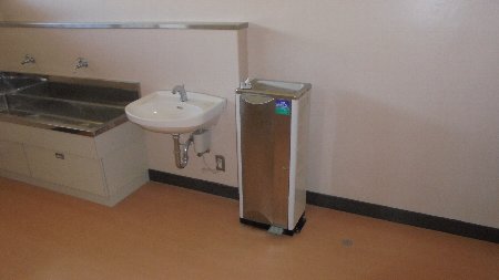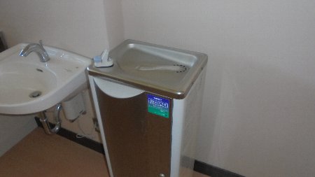 大海小学校体育館の更衣室には写真のような冷水器が備え付けられています。長年使っていたので男子更衣室の器械から出る水が冷えなくなりました。修理点検をお願いしたところ、修理不可能ということになりました。女子更衣室のものも衛生上問題があると言うことで使用不可になりました。