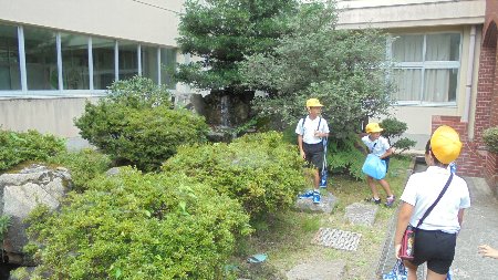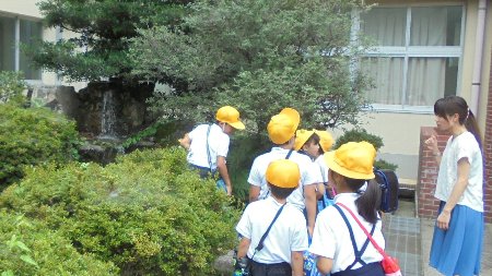 ひさしぶりの登校日の帰り、いつものように集団下校のため玄関前に集まると、横のメダカ池から水の流れる音が・・・