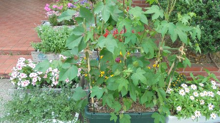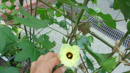 2016年8月4日 08時19分 地域の方からいただいた綿が花をつけました。背も高くなったので支柱を作ってくださいました。いつも本当にありがとうございます。