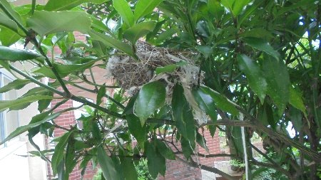 今度は、保健室の窓の真ん前に野鳥が巣作りをしました。草や枝、どこから持ってきたのか布やナイロンのひもなどいろいろな材料が使われています。中はまん丸でとってもきれいです。ところが発見当時から鳥の姿が全然見えないのです。ふんも卵の殻も見あたらず・・・近づくと人間のにおいで巣を捨てることもあるので細心の注意を払っているのですが。ぜひこの巣で子育てしてほしいものです。