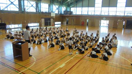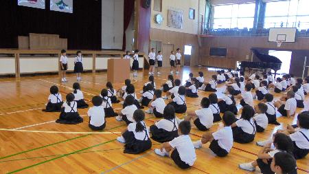 今日の昼休みは、7月の学校集会でした。給食の後片付け後、いつもの通り静かに体育館に集まることができました。