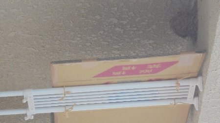 2016年6月29日 12時50分 体育館からプールへの入り口にツバメが巣を作ったことを報告しました。ツバメは子どもたちの賑やかさに驚いていますが、私たちはツバメのふんに困っていました。そこで校務士の和泉さんが工夫して、ふんが床に落ちないように作業しました。使った道具は押し入れなどに棚を作る引っ張り棒です。これでツバメも人間も安心して暮らせます。