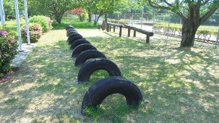 もうすぐ管理公社の人たちに草刈りしてもらいますが、一足早く遊具の場所をきれいにしてもらいました。低学年がさっそく丸太やタイヤで遊んでいます。校務士さんありがとう。