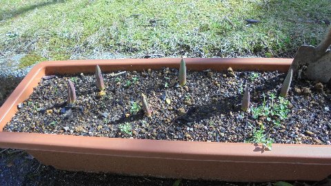 今週は立春が過ぎ、とたんに春めいてきた感じがします。しばらく外の様子を見ていませんでした。プランターに目をやるとチューリップの芽がつくつく出ていました。この花が咲く頃には・・・うれしくなります。