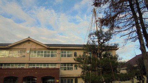 もうすぐ子ども達が登校してきます。朝から暖かい空気、外の方が温度が高いようです。きれいな空と宝達山。庭に目をやればいつの間にか雪つりが・・・