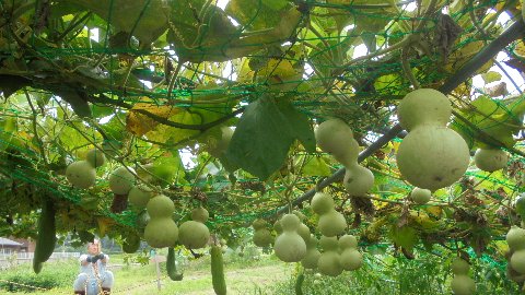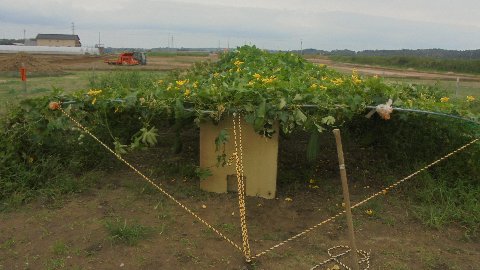 2018年9月9日 13時50分 台風でつぶれたヘチマだな、持ち上げました。収穫までこの状態を維持したいものです。来年は何かいい方法を考えなければ・・・。