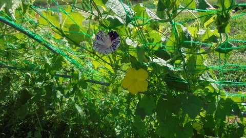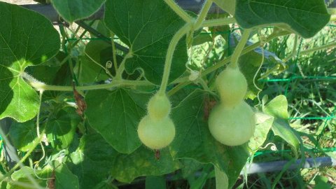 4年生のヘチマといっしょにいくつか他の植物を植えました。せっかくの大きな棚なのでつる性のものを・・・アサガオ、フウセンカズラ、、千成りひょうたん、それぞれ実を付けてきました。負けるな、ヘチマ!