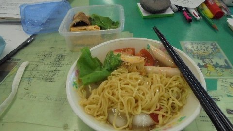給食が止まっているので、夏季休業中の職員室は、思い思いの昼食です。写真は「大海小学校冷やし中華」です。麺はインスタントラーメン、具には学校でとれたトマトを使っています。キュウリをのせ忘れてしまいました。皿はいつもの給食の皿ですね。