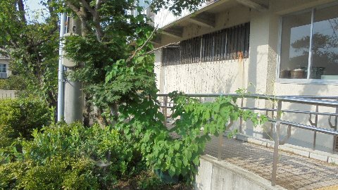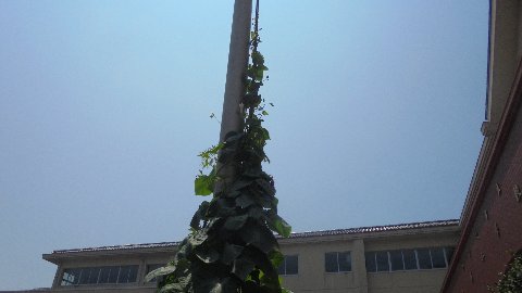 体育館前にはこんな感じで、今年もアサガオを自然木に絡ませてあります。これからたくさん咲きます、早朝の散歩コースにいかがですか。地域の方からいただいたフウセンカズラも小さな花を付け始めています。