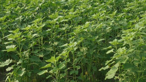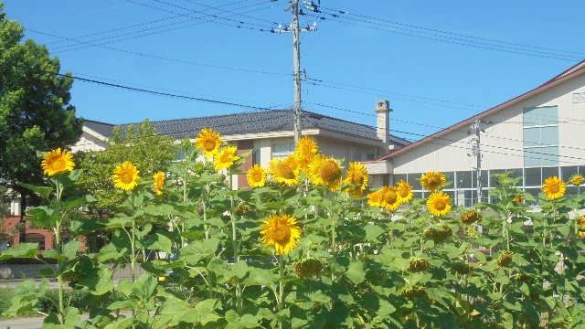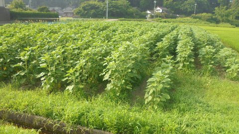 ここが元祖ひまわり畑です。夏栗の地域の方がボランティアで育てておいでます。ここから種と肥料を分けていただきました。まだ花は見当たりません、一斉に開花するときれいでしょうね。先日夏栗の区長さんが学校のひまわりを見においでました。学校も負けずに育てます。