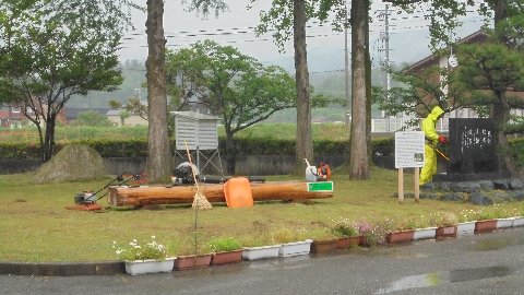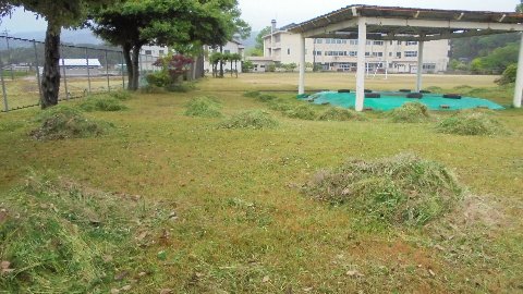 校地の草が伸びてきたので管理公社のみなさんに草刈りをしてもらいました。雨の中たくさんの草を処理していただきました。こんなときもふるさとベンチが役立ちます(笑)
