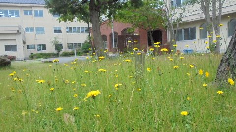 【写真は除草前のタンポポ畑、もう少し見頃は続いたかも】