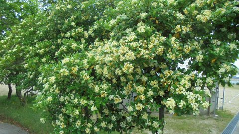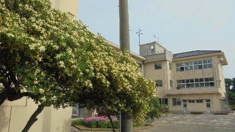 校庭をぐるっと囲むように植えられた木、トベラが今年も花を付けました。これから秋に実を付けるまで長い間鑑賞できる樹木です。