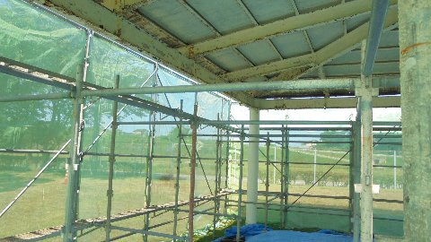 地域の皆さんの念願だった相撲場の改修が始まりました。まずは足場が組み立てられました。上って間近に見ると痛みの激しさがより分かりました。7月は新しくなった土俵で熱戦が繰り広げられることでしょう。