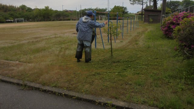 花壇が桜草とクローバーで盛り上がっています。運動場側は開けてあります。去年はホウセンカやひまわりが植えられました。今年はどうしようか迷っている内に去年落ちた種が芽吹いています。