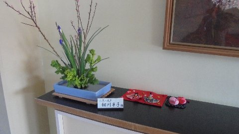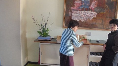 生け花ボランティアの細川さんが花を生け替えに来て下さいました。桃の花がきれいでした。まだしっかりとつぼみです。これが開くといよいよ・・・。ありがとうございます。
