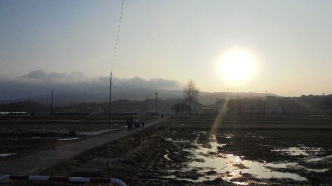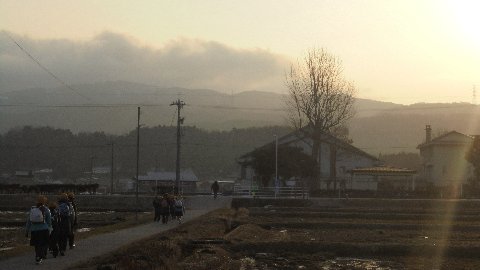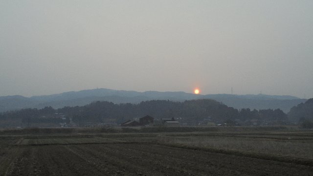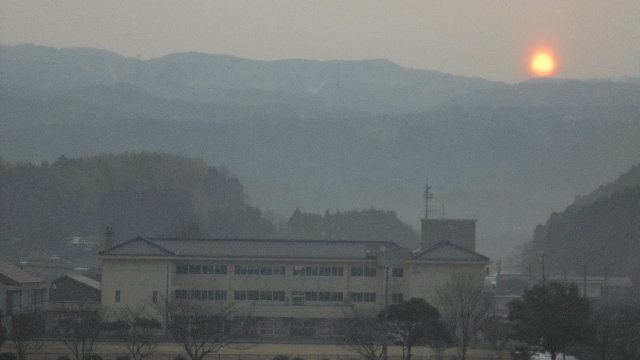 2018年2月28日 12時21分 今朝偶然にもこんな光景に出会うことができました。宝達山の山際からちょうど朝陽が昇り始めています。それも春霞?で赤く見える太陽。以前は暗い間に登校していたのに、すっかり日の出時間も春です。