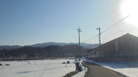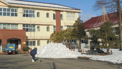 今日も良い天気になりそうです。宝達山がくっきり、朝陽がまぶしいです。プールはご覧の通り、厚い氷?雪?におおわれています。見えないところに危険があります。昨日は地域の方から雪の危険箇所について情報をいただきました。明日からの土日、安全に過ごせるようお家でも指導願います。