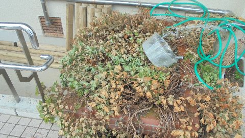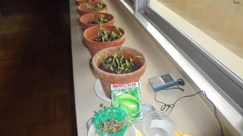 体育館前のゼラニウムもこのところの寒さでご覧の通り。理科室では春に備えて育てているものがあります。何かわかりますか、春になったらチョウチョがこれに卵を産んで青虫になります。わかりましたね、キャベツです。