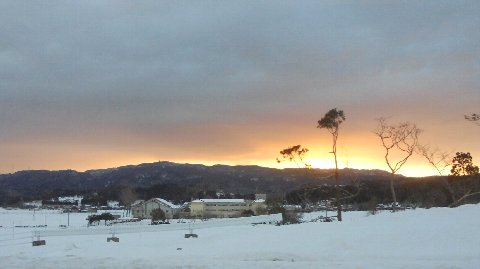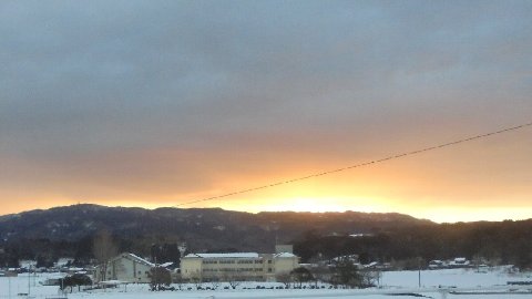 朝焼けです。今日は雪空から解放されて青空です。