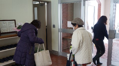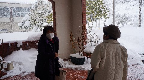 2018年2月8日 12時59分 吉村さん、葛葉さん、ミシンの先生ありがとうございました。雪がたくさん降る中お帰りになりました。せめてお見送りだけでも。学校全体日常が戻って来ています。