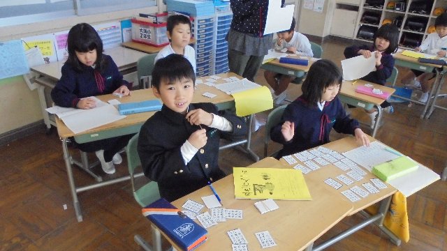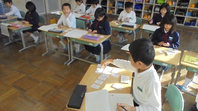 2年生の教室をのぞくと、みんな一生懸命にカードを作っています。はさみでちょきちょき、字も書き入れています。百人一首です。新春に大会をします。冬休みの間にたくさん覚えて下さいね。本番では一枚でも多くとれるといいね。