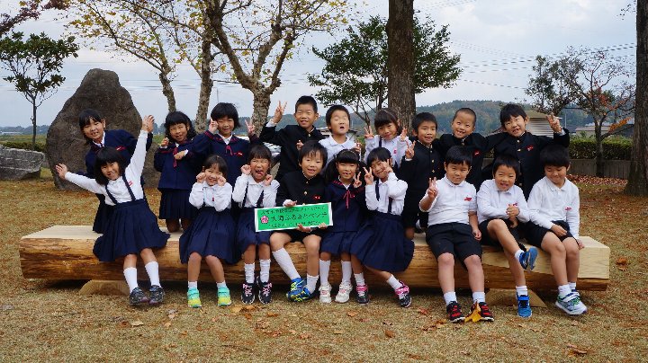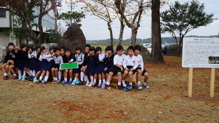 市役所からお願いされてベンチに座る子どもたちの写真をとりました。モデルはなにをしてもかわいい1年生です。たくさん座れますね。さすが巨大ベンチです。