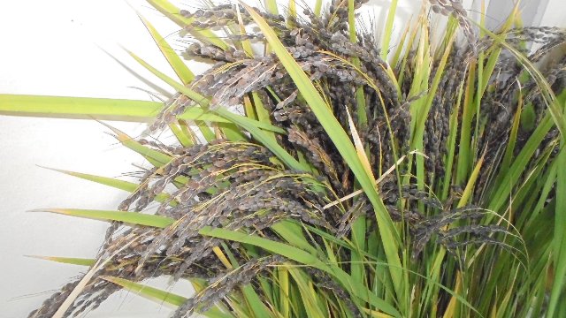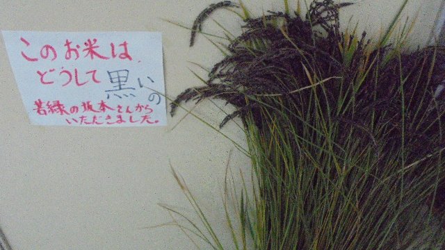 今日、若緑の坂本さんがベンチのお披露目会の準備においでました。その折、刈ったばかりの稲たばを持ってきて下さいました。子どもたちは、不思議そうに見ていました。中には、なぜ黒い穂なのか知っている子もいました。