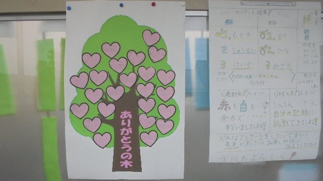 ゲストティーチャーの皆さんありがとうございます。しっかり気をつけていきます。もう一枚は毎年恒例のありがとうの木です。たくさんハートの葉っぱが付くといいですね。