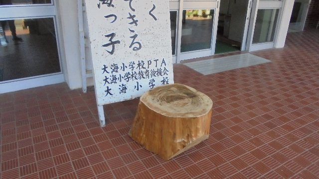 もう一つは大海ふるさとベンチを作った切り株を玄関に展示しました。年輪がきれいに浮き出て数えることができます。もちろん座ることもできます。