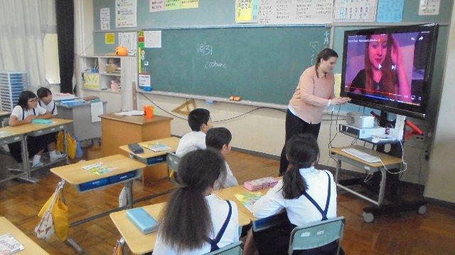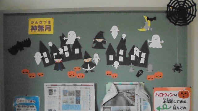 英語の学習で、ローラさんからハロウィーンの文化について教えてもらっています。お菓子がもらえるんですね。図書室の前の掲示もこの通り、イオンに買い物へ行くと飾り付けがハロウィーン。すっかり日本の文化と合わさっていますね。 ところでいつでしたっけ(笑)