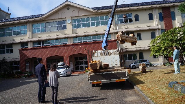 2017年11月1日 17時22分 ついにベンチが森林組合から搬入されました。林PTA会長が学校開放でおいでたので、設置場所を相談しながら・・・。すぐにブルーシートで包み、子どもたちにはベンチに乗ったり触ったりしないように指導しました。