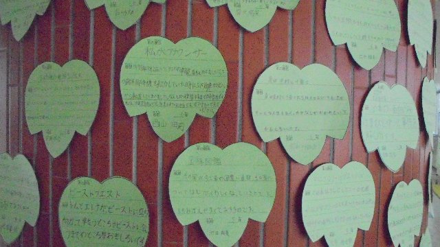 児童玄関に太い太いブドウの木が現れました。葉っぱがいっぱいついていて、一枚一枚に全校児童が読んだ本の感想が書かれています。読書の木です。