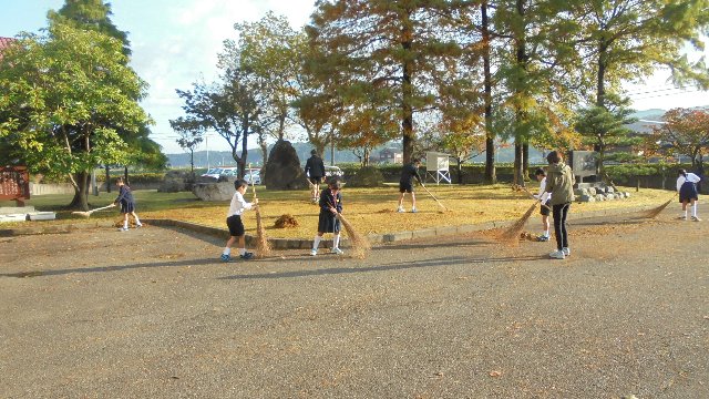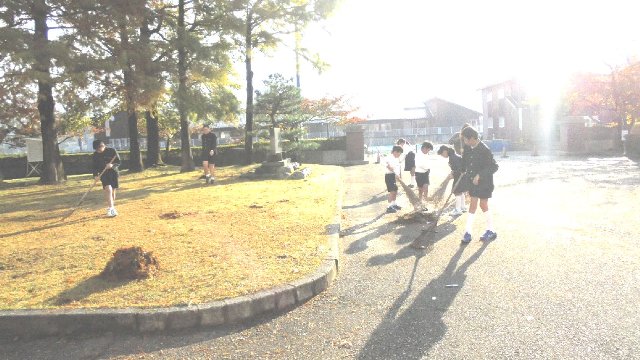 朝陽がまぶしい中、落ち葉掃き。全校できれいにしましたが、最後の仕上げはさわやか委員の皆さんです。前期委員会の仕事もあと数日ですね。ごくろうさま。