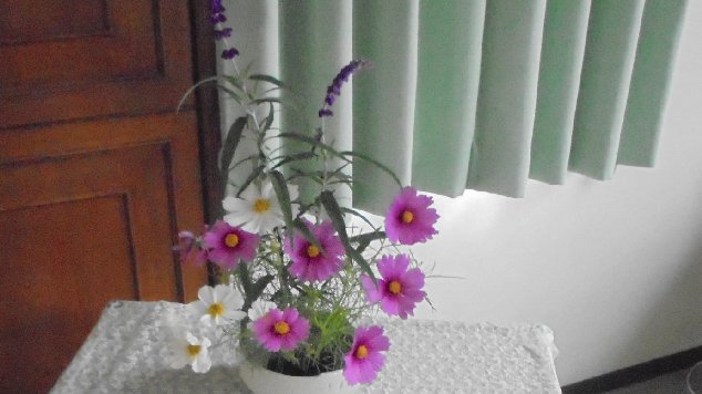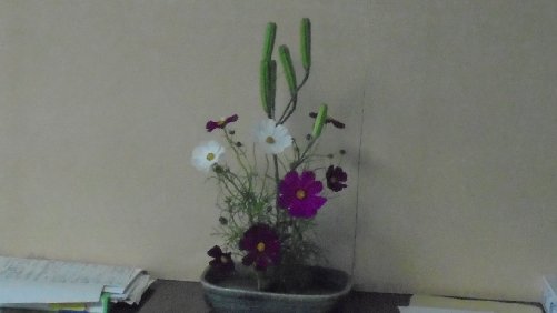 花を生けていただきました。生け花ボランティアの細川さんありがとうございました。今回は、4つもいけていただきました。コスモス・・・花びらが大きくてとても秋らしい雰囲気です。
