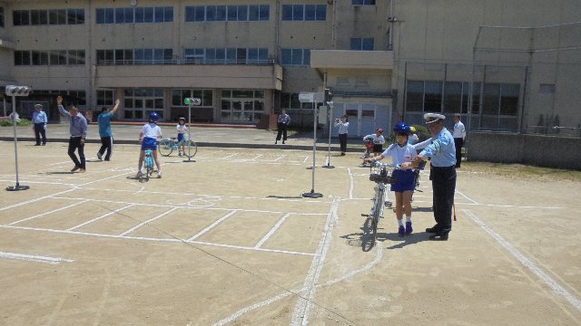 家から自転車を運び、自転車安全教室が開かれました。今年の3.4年生は自転車の運転が上手だとほめられました。今日習ったこと,練習したことをしっかり守って交通事故に気をつけましょうね。