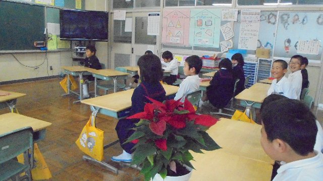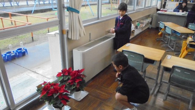 この花を見ると年末なんだなぁと感じます。学校では、12月のありがとう集会に向けて、ポインセチアを育てています。当日お世話になったみなさんにプレゼントします。短い期間ですが、一生懸命お世話してほしいと思っています。思いやりの心を育てる事をねらいとしています。くわしくは学校便りもあわせてご覧下さい。