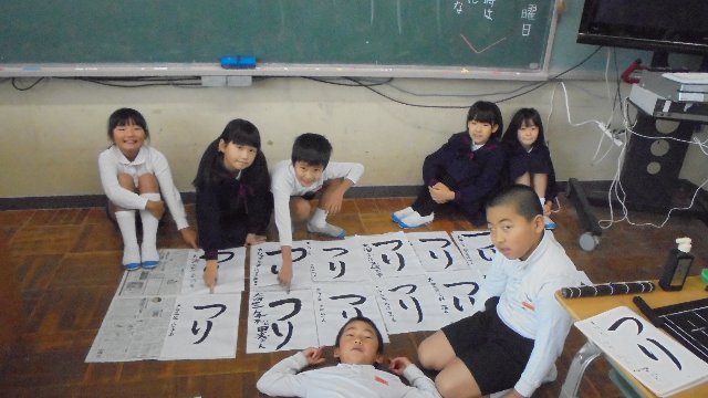 まずは、3年生。今年から毛筆を始めたのにこんなに上手になりました。しかし、このクラスはカメラを向けると集まってきますね(笑)