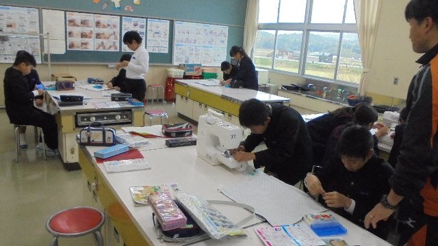 もう一枚は、6年生の家庭科。裁縫で実用品を作っています。ミシン縫いが終わり、手縫いで仕上げています。生地を裏向けで作業しているので、まだどんな仕上がりになるかわかりません、残念。