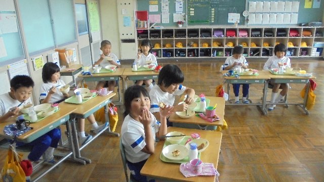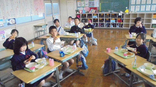 この日のメニューはかほっくりを使ったパンでした。みんな大好物、ぺろりと平らげていました。楽しく食事をしている中学年です。お家でもその日の給食を話題にしても良いですね。
