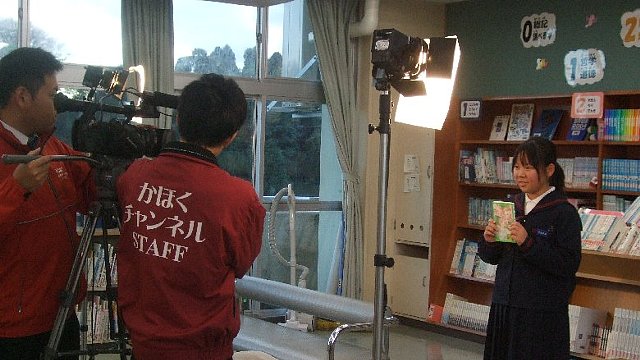 図書委員のおすすめの本というテーマで取材が入りました。代表で安藤さんと竹田さんに出演してもらいました。二人とも緊張することなく、一発OKでした。いったいどんな本を紹介してくれたのでしょうね。楽しみです。