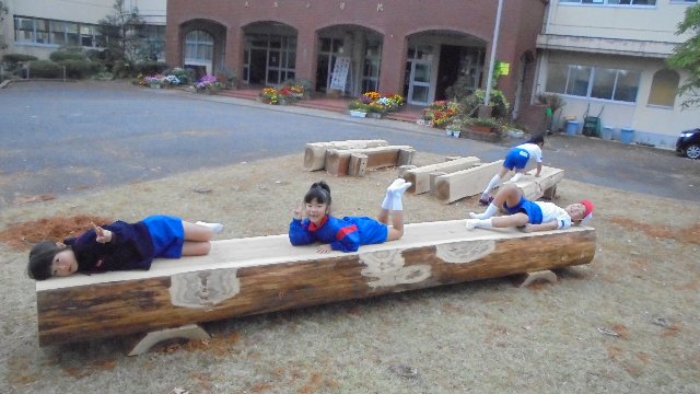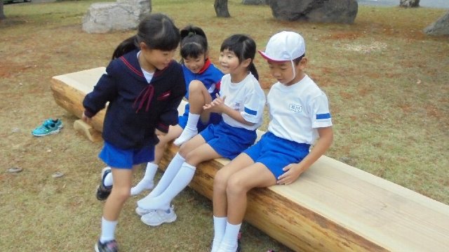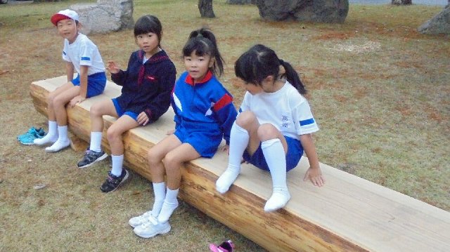 休み時間、ベンチのまわりに事が集まっています。興味津々。肌触りが良いのか寝そべって顔をすりつけています。しっとりしているそうです。