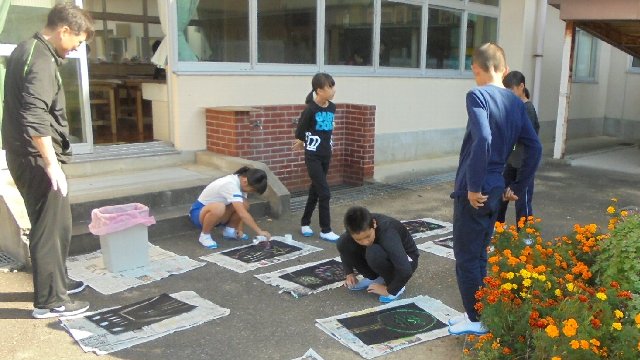 制服を脱いで汚れても良い普段着に、図工室の外で黒いペンキのスプレー。何をしているのかと思いきやどうも版画の作品を制作しているみたいです。