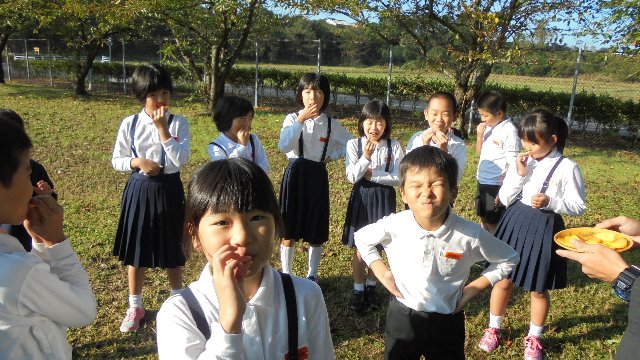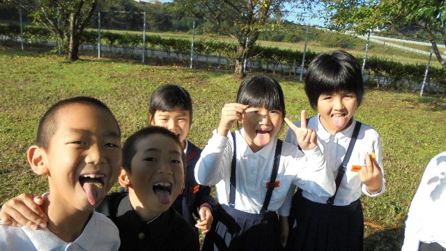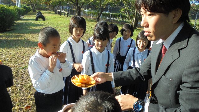 朝一番に3年生が昨日学習を開始した紋平柿の試食をしました。紋平柿は渋柿、渋いってどんなかんじ、体験するために食べてみました。渋かったらぺっとはきだせるよう、外で。