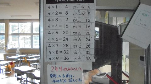 九九の学習が始まっています。2年生教室の入り口では、これをクリアーしないと・・・