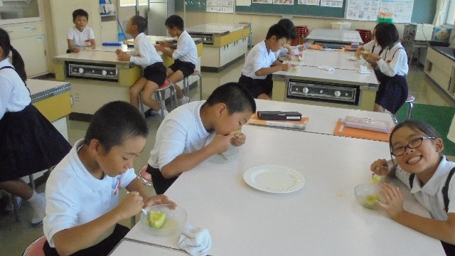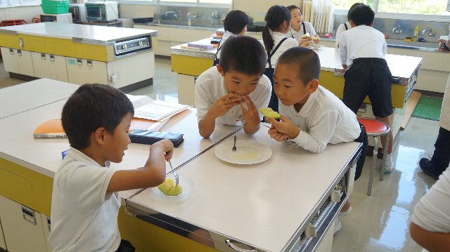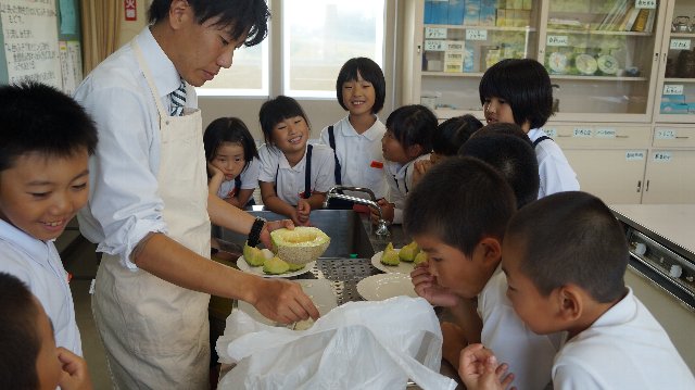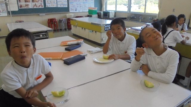 食べているのは「足守メロン」、高級メロンです。どうして3年生が?これで3年目になります。ヒントは「フルーツの交流」です。ありがとうございます、岡山市蛍明小学校のみなさん。